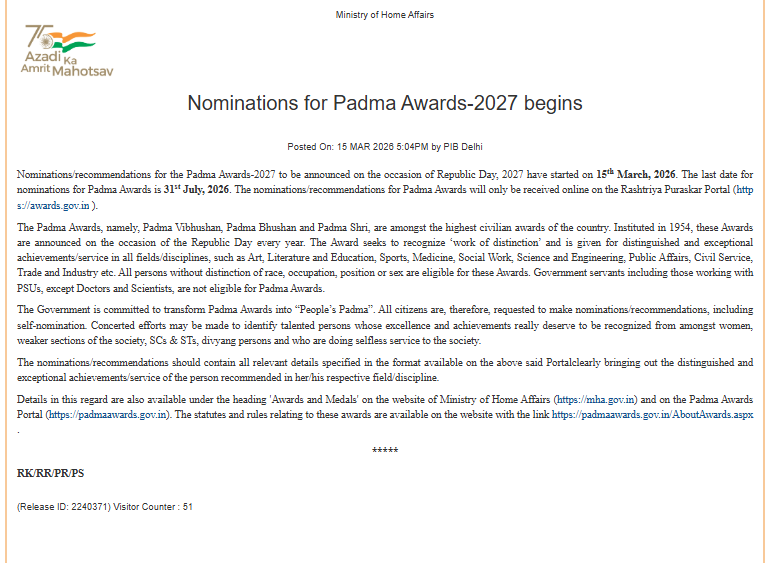 𝐍𝐨𝐦𝐢𝐧𝐚𝐭𝐢𝐨𝐧𝐬 𝐟𝐨𝐫 𝐏𝐚𝐝𝐦𝐚 𝐀𝐰𝐚𝐫𝐝𝐬-𝟐𝟎𝟐𝟕 𝐛𝐞𝐠𝐢𝐧 Nominations/recommendations for the Padma Awards-2027 to be announced on the occasion of Republic Day, 2027, have started. The last date for nominations for Padma Awards is 31st July, 2026. The nominations/recommendations for Padma Awards will only be received online on the Rashtriya Puraskar Portal: Ministry of Home Affairs