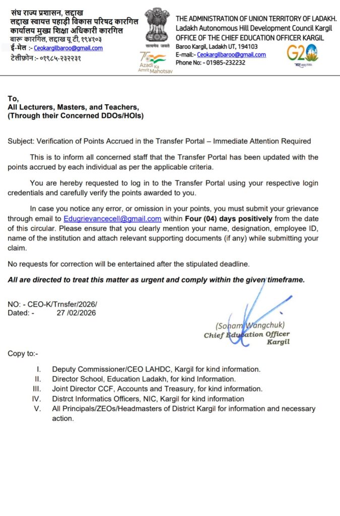 Concerned staff are advised to log in to the Transfer Portal immediately using their respective credentials and carefully verify the points awarded.