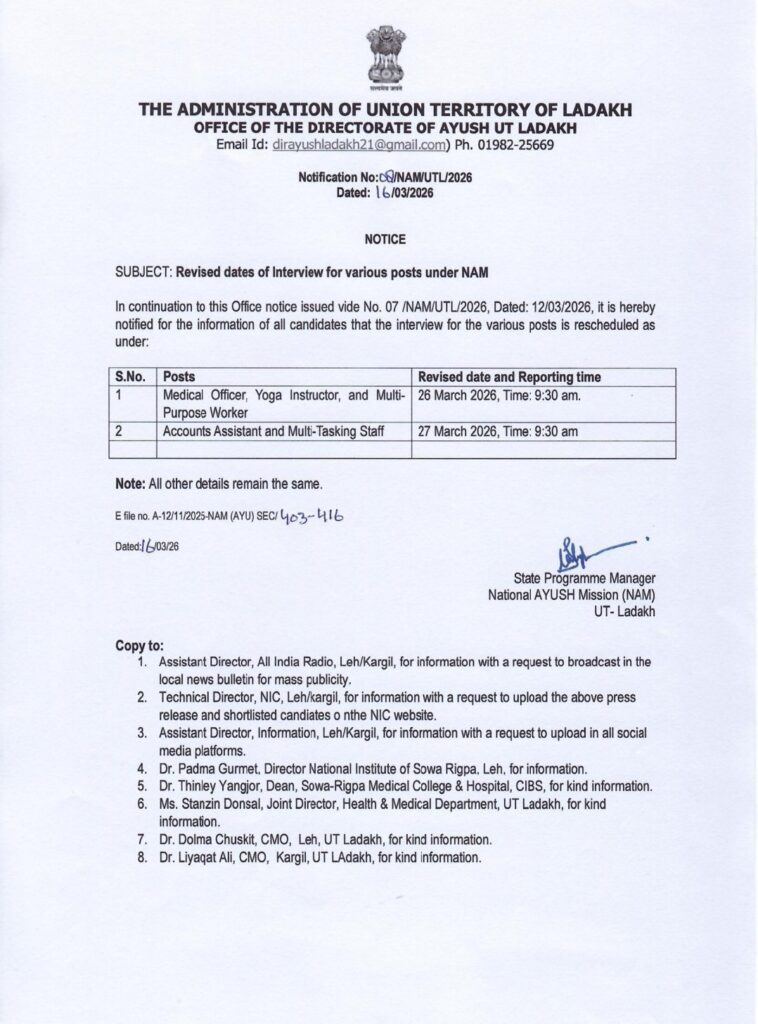 The Directorate further stated that all other details mentioned in the previous notification will remain unchanged.The notice was issued by the State Programme Manager, National AYUSH Mission (NAM), UT Ladakh for the information of all concerned candidates.