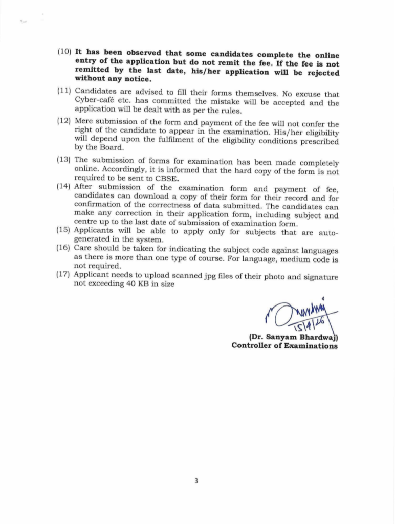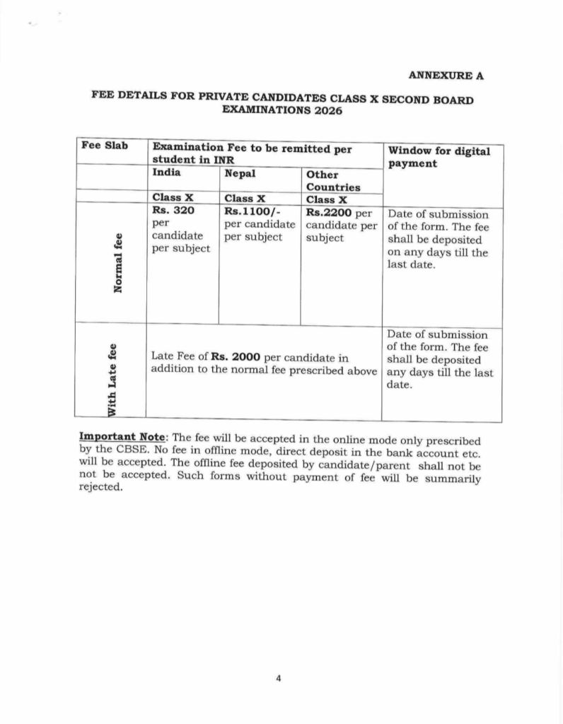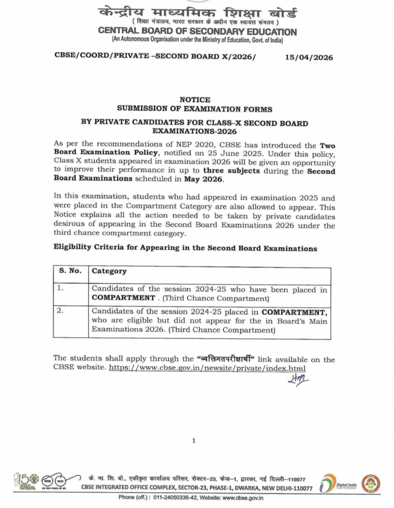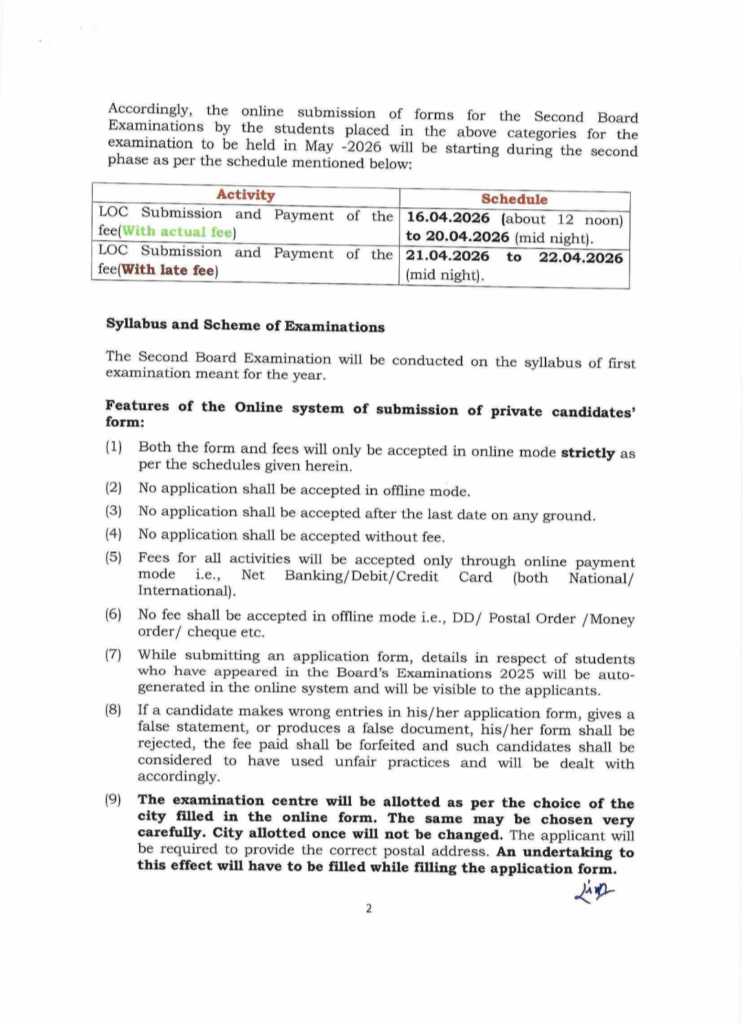 The Central Board of Secondary Education has announced that the submission of examination forms for Class X Second Board Examinations (May 2026) for private candidates is now open.As per the official notification, eligible private candidates can submit their examination forms within the following schedule: