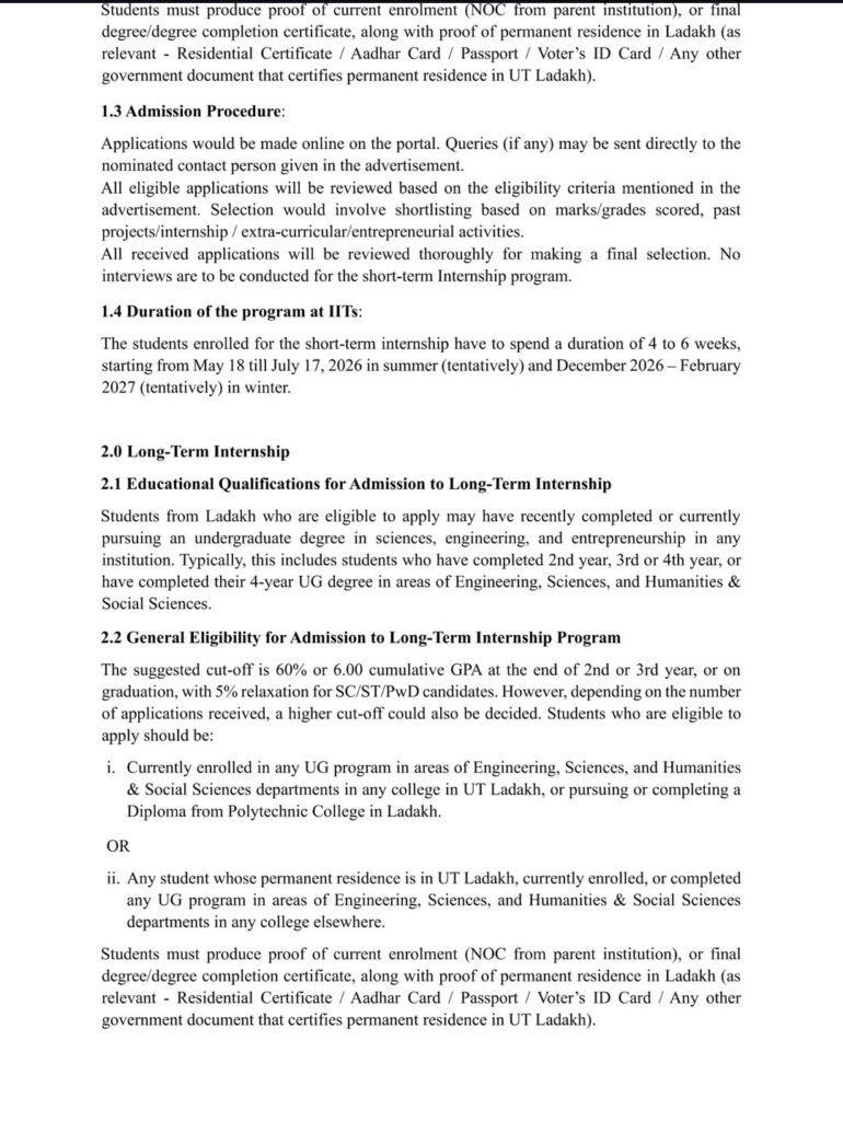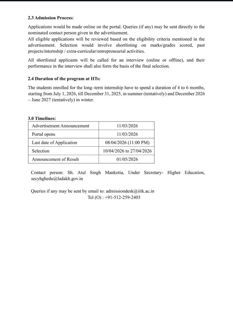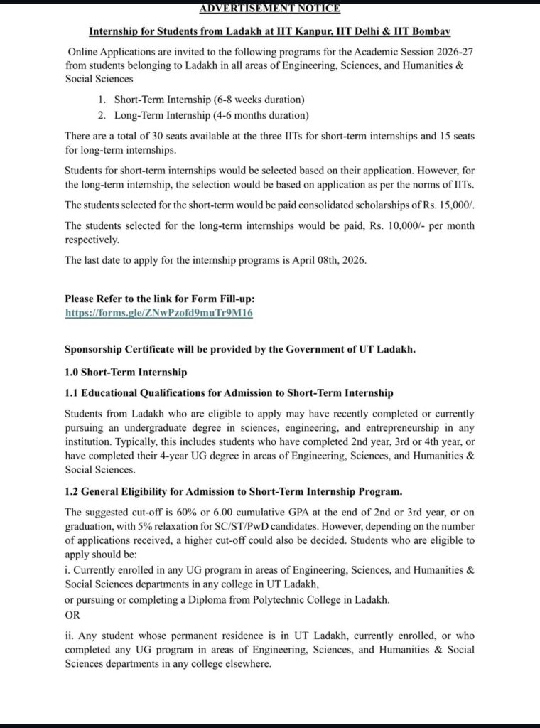 Students from Ladakh now have a valuable opportunity to apply for Short-Term (6–8 weeks) and Long-Term (4–6 months) internships for the 2026–27 academic session at premier institutions including Indian Institute of Technology Kanpur, Indian Institute of Technology Delhi, and Indian Institute of Technology Bombay.