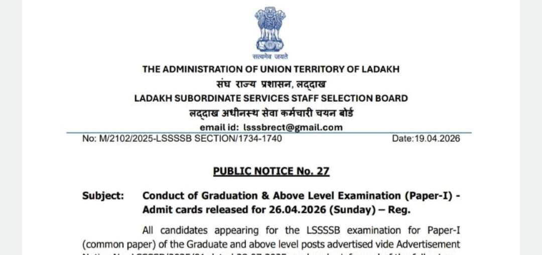 The Ladakh Subordinate Services Staff Selection Board (LSSSSB) has issued Public Notice No. 27 regarding the conduct of the Graduation & Above Level Examination (Paper-I).The Board has informed that the…