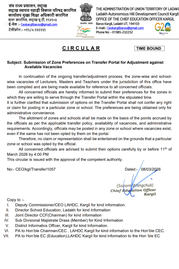 Posted inEducation Ladakh Latest news Submission of Zone Preferences on Transfer Portal for Adjustment against Available Vacancies Posted by Ladakh News Hub March 9, 20261 Submission of Zone Preferences on Transfer Portal for Adjustment against Available Vacancies Ladakh News Hub Delivering news that matters. Get timely updates on current events, trending topics, and in-depth analysis. Join us for a daily dose of information. View All Posts Post navigation Previous Post Ayatollah Seyyed Mojtaba Khamenei elected new Leader of the Islamic RevolutionNext PostMP Ladakh Mohmad Haneefa Jan Updates on Zawars Stranded in Iran