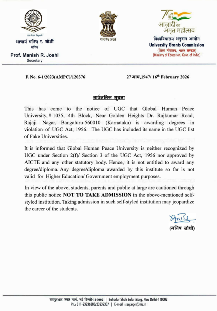 The University Grants Commission (UGC) has declared Global Human Peace University as a fake university. The institution is not recognised by the UGC and is not authorised to award any degree or diploma.Students, parents, and the general public are strongly advised not to take admission in this self-styled institution, as any degree or diploma issued by it is invalid for higher education and not acceptable for government or public sector employment.Stay alert. Stay informed.Choose only UGC-recognised institutions for your education.